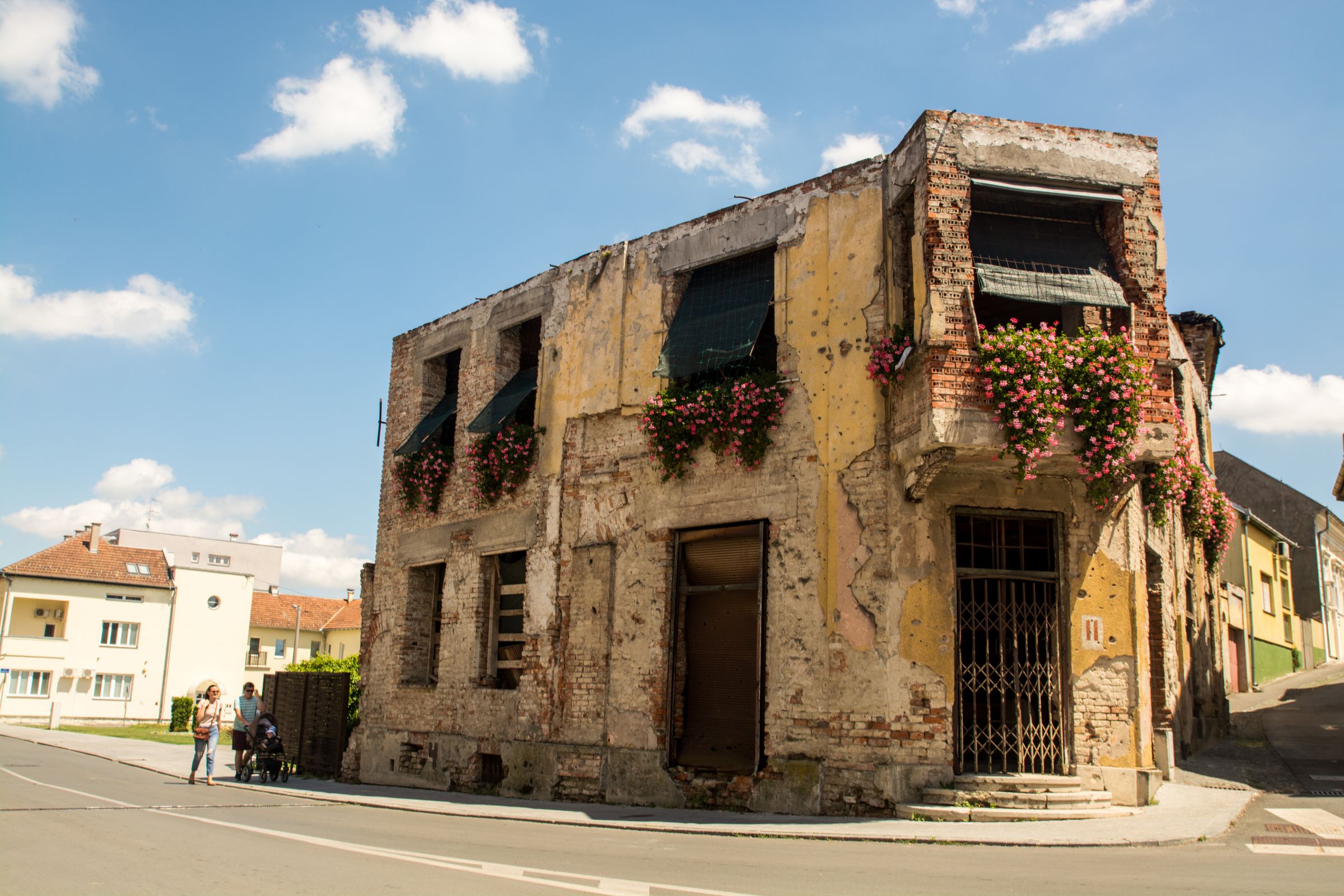 The destroyed building decorated by flowers in the center of Vukovar.